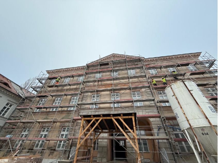Obecnie trwa montaż stolarki okiennej, budowa nowych klatek schodowych i szybów windowych, montaż ścianek działowych g-k, układanie instalacji elektrycznych, montaż kanałów wentylacyjnych oraz wykonywanie nowych tynków i posadzek. Widać pierwsze efekty robót konserwatorskich elewacji - budynek odzyskuje dawną elegancję, odtworzono elementy sztukatorskie gzymsów, opasek okiennych i boni. Ponadto rozpoczęły się prace konserwatorskie ogrodzenia od strony Placu Trzech Krzyży oraz renowacja rzeźb kamiennych.