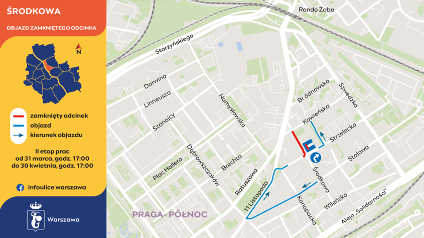 W kolejnym etapie drogowcy przeniosą plac budowy na drugą stronę skrzyżowania Środkowej ze Strzelecką. Kierowcy od strony Stalowej skręcą w Strzelecką tylko w prawo – w stronę Szwedzkiej. Tak jak wcześniej Strzelecka będzie kończyła się ślepo przed placem budowy. W tym etapie piesi przejdą Środkową po parzystej stronie ulicy. Prace na odcinku od Kowieńskiej do Strzeleckiej potrwają do końca kwietnia. Później wykonawca przeniesie się na odcinek od Stalowej do Strzeleckiej. Zakończenie prac na Środkowej planowane jest jesienią.