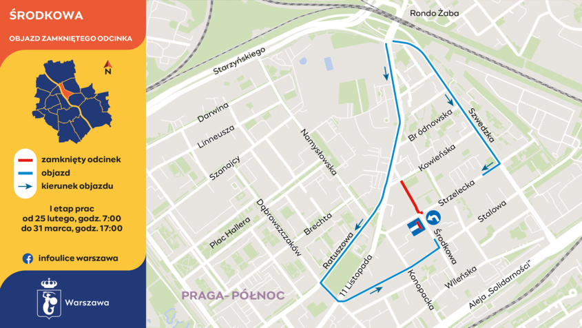 Rozpoczyna się modernizacja Środkowej na Pradze-Północ. W środę, 25 lutego, zostanie zamknięty odcinek od Kowieńskiej do Strzeleckiej. Po przebudowie ulica będzie pełną zieleni, atrakcyjną przestrzenią publiczną.